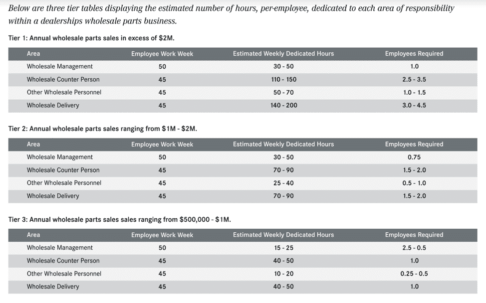 The table below was specifically created just for dedicated wholesale sales as a reference of suggested staffing levels. The back parts counter is based on how many technicians and service advisors the parts department needs to support.