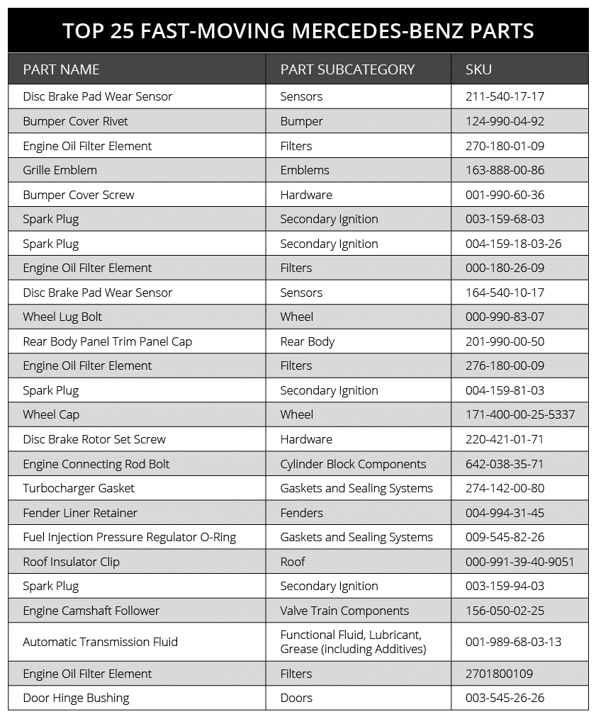 We know what you’re thinking: “My parts inventory has way more than just 25 parts!” That’s why we compiled a full list of the top 150 fast-moving Mercedes-Benz parts. Stock your parts and accessories business with these parts and you’ll show your customers they never need to shop anywhere else.