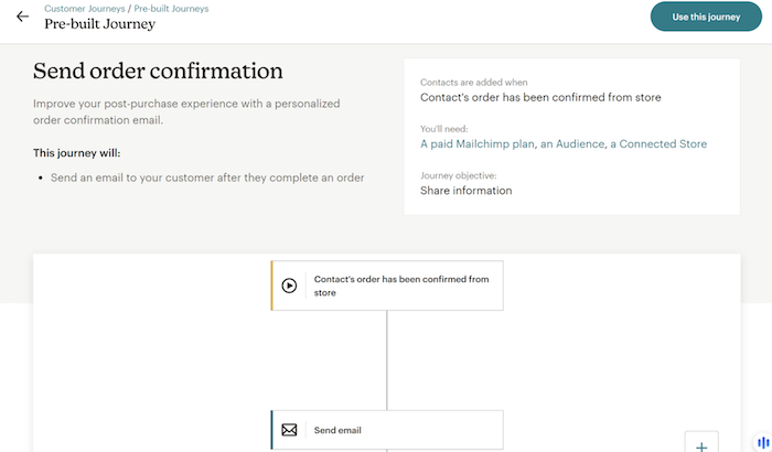On the home screen, navigate to the “Automations” tab on the left. Click on “Pre-built journeys” to see a list of available options. Select a journey that fits your goal. For instance, one of the most common types of email you’ll need is an order confirmation, so click on that journey. When it opens, you’ll see that there are pre-scheduled actions. In the beginning, you don’t have to do anything with those. Next, you’ll need to create your first email.