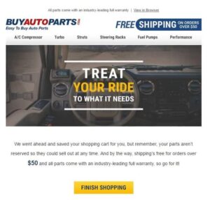 The most successful cart recovery emails include an image. Whether it’s an image of a part in your customer’s cart (like NAPA did) or a generic car-themed image (like above), pictures are pleasing on the eye and make your email more enjoyable overall.