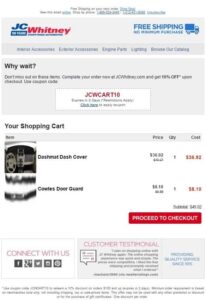 This time, they include a discount: 10% off during checkout. Similar to BuyAutoParts, JC Whitney recognizes that price is an important factor in the buying process. A few dollars just might be enough to sweeten the deal and win a sale.