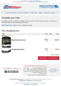 Although it’s simple and not as colorful as the above to examples, JC Whitney also uses a basic cart recovery email to try to bring back sales. To the left is theirs.