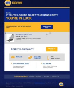 The result? The email is instantly recognizable as NAPA. Additionally, we better understand the NAPA brand and what it’s all about. They’re friendly, informal, and ready to lend a hand. They also care about each customer’s business, since they’re willing to invest the time in creating and sending an abandoned cart email.