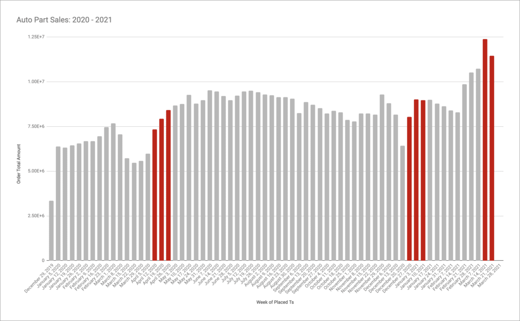 The third COVID-19 relief stimulus checks of $1,400 began being distributed on March 17th, 2021. While parts sales began to rise at the beginning of March, there was a significant uptick in sales the week the stimulus payments hit.