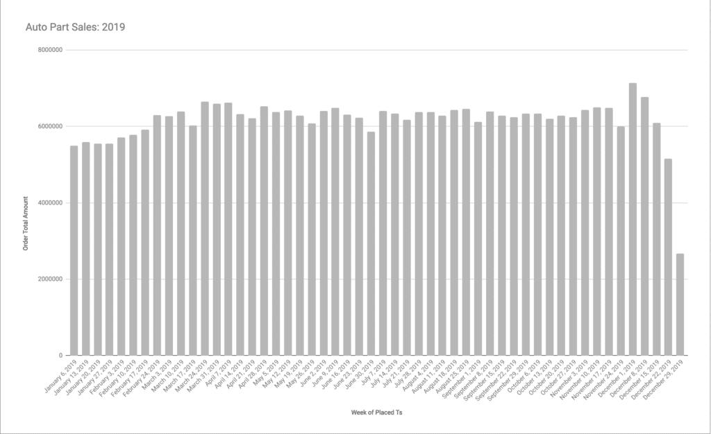 The week of April 12th saw a $1.4M increase after a drop of $1.6M following a national emergency declaration. From this point, dealers on the RevolutionParts platform saw a more steady stream of sales throughout the year, thanks to their ability to sell parts online to millions of Americans, whether or not they were shopping in person.